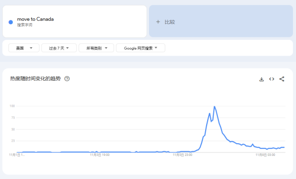 在唐纳德·特朗普赢得美国总统大选后,一些失望的美国人正考虑离开美国,谷歌上与移居海外有关的搜索量飙升。 谷歌趋势(Google Trends)——谷歌旗下一款基于搜索数据的分析工具——显示,在特朗普将重返白宫的消息传出后,与“离开这个国家”和“如何移居……”相关的搜索量激增。 “移居加拿大”的搜索量在11月6日达到顶峰,谷歌趋势显示,在佛蒙特州、缅因州、俄勒冈州等民主党大本营,对这一搜索关键词的兴趣最高。 在两个关键的“蓝墙”摇摆州——威斯康星州和宾夕法尼亚州,以及俄勒冈州、明尼苏达州和印第安.
